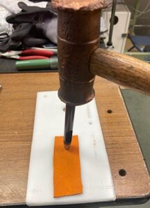 革を入手して、これにハトメ打ちを行う事にしました。革にハトメのサイズに合う穴(Φ8)を明ける為、専用ポンチで打ち抜きます。
